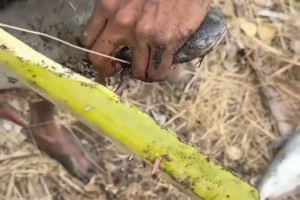 第一次见这么去刺的,网友用棒子给叉尾鱼去刺